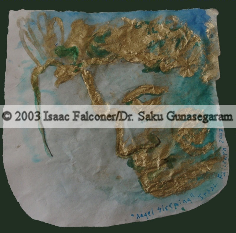 Angel Sleeping ©2003 Isaac Falconer/Saku Gunasegaram. Irregular dimensions, roughly 9" x 9"acrylic and gold ink on hand-made rice paper