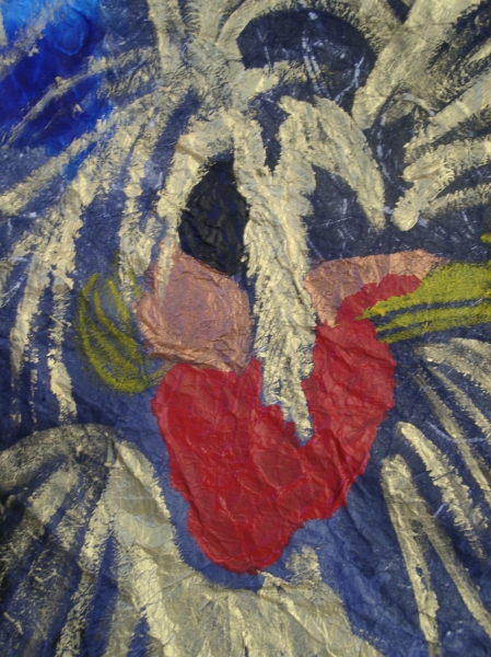 Detail: A Venetian Masked Chicken ©2004 Isaac Falconer/Saku Gunasegaram acrylic and oil pastel on hand-made rice paper